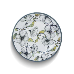 The Graphite Bloom design features hand-drawn style white and charcoal flowers set against a serene white canvas, complemented by soft green and yellow leaves. The subtle blue-grey rim adds a structured, elegant frame. This aesthetic is both modern and deeply artistic, ensuring this plate brings effortless sophistication to every table.