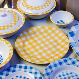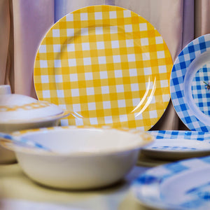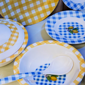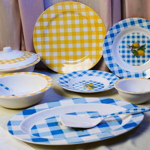 Bring the joyful, sun-drenched spirit of a Mediterranean picnic to your dining table with the Lemon Squares Dinner Set. This vibrant collection combines the cheerful energy of bright yellow and clear blue gingham with the fresh elegance of lemons, creating a look that is both delightfully classic and wonderfully modern. It’s the perfect backdrop for everything from breezy summer lunches to cozy indoor gatherings.