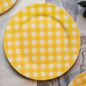 The Lemon Squares design showcases a bold, edge-to-edge gingham check pattern in vibrant sunflower yellow and clean white. The crisp lines create a graphic, modern aesthetic that feels simultaneously nostalgic and fresh, offering an instant mood lift to any dining setting.