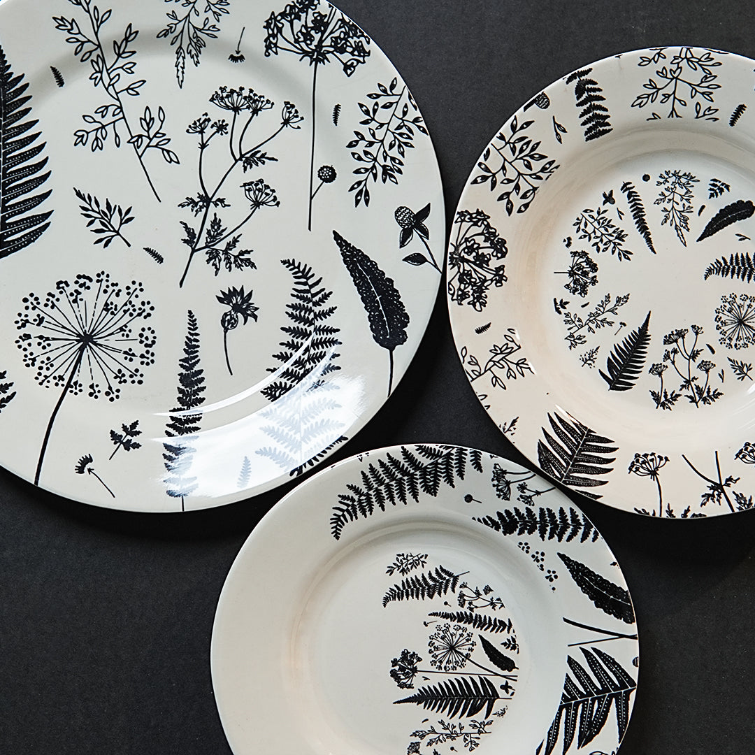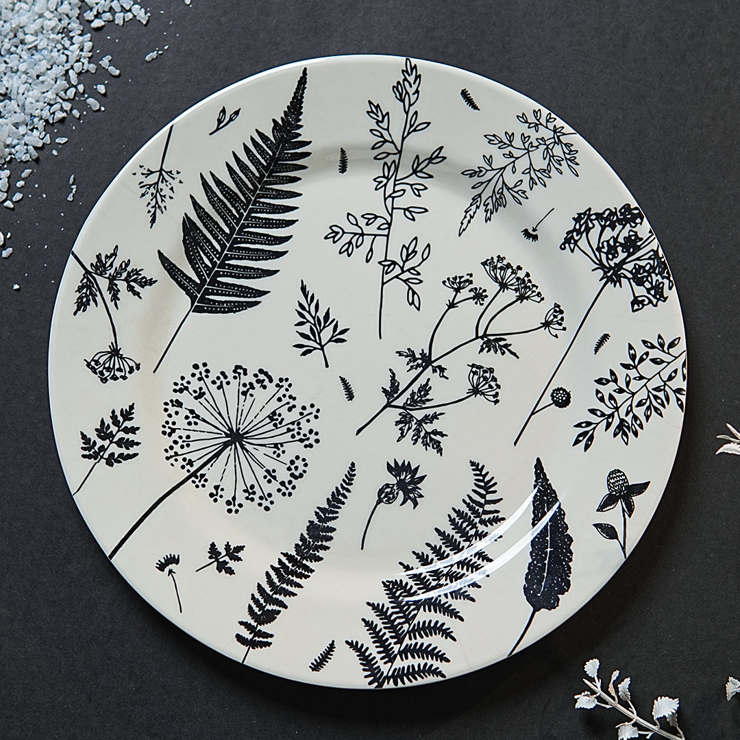 The Midnight Fern collection is inspired by the delicate textures of nature. Detailed renderings of fern fronds and wildflowers sweep across the plate, creating a dynamic yet graceful aesthetic. This monochromatic design provides a stunning, high-contrast backdrop that elevates the presentation of everything from vibrant vegetable stir-fries to classic rice dishes.