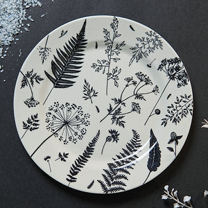 Bring the serene beauty of a moonlit garden to your dining experience with the Midnight Fern Rice Plate. Featuring a generous 11-inch diameter, this plate showcases intricate, ink-black botanical illustrations against a pristine white surface, making it a sophisticated centerpiece for any meal.