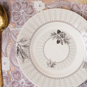 Enhance your dining table with the rich contrast and subtle beauty of our Shadow Bloom Quarter Plates. Measuring 7.5 inches in diameter, these plates feature a delicate floral design set against a deep, moody backdrop—perfect for serving generous portions with style.